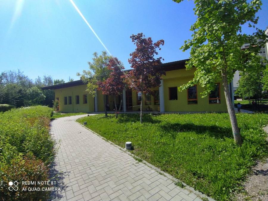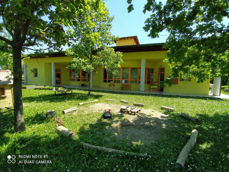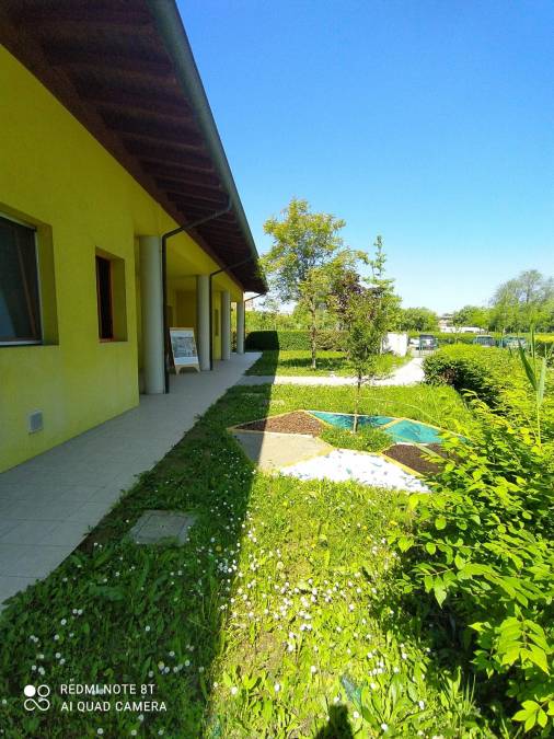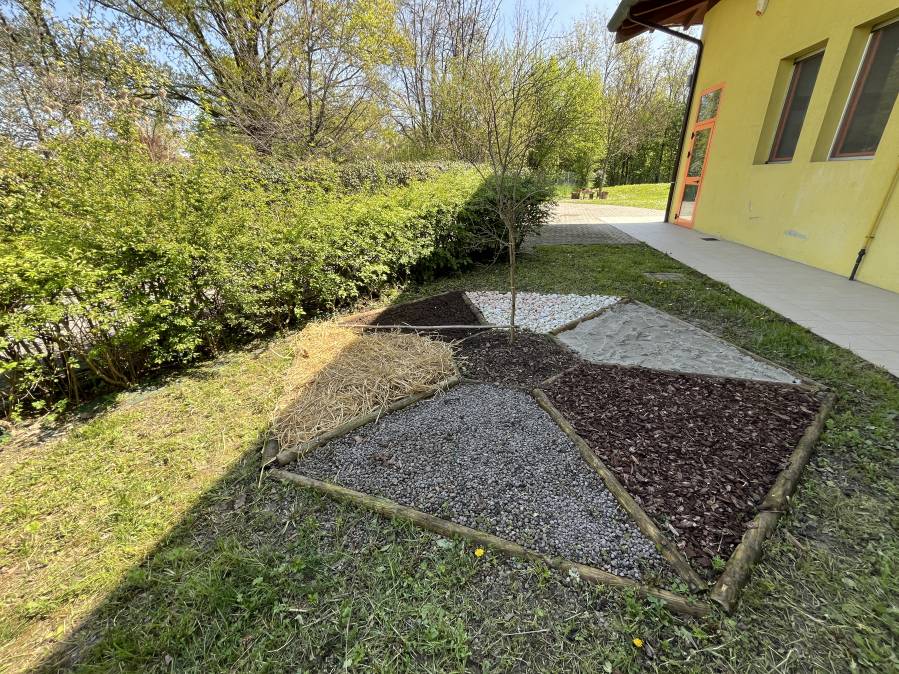 Gli spazi esterni sono attrezzati con tavoli, dove svolgere attività creative con i materiali naturali ma anche intraprendere esplorazioni e ricerche scientifiche sul campo: categorizzare, contestualizzare, fare di conto e arricchire il vocabolario linguistico dei bambini, sono solo alcune delle esperienze che l’ambiente esterno offre in continuità con quello interno.